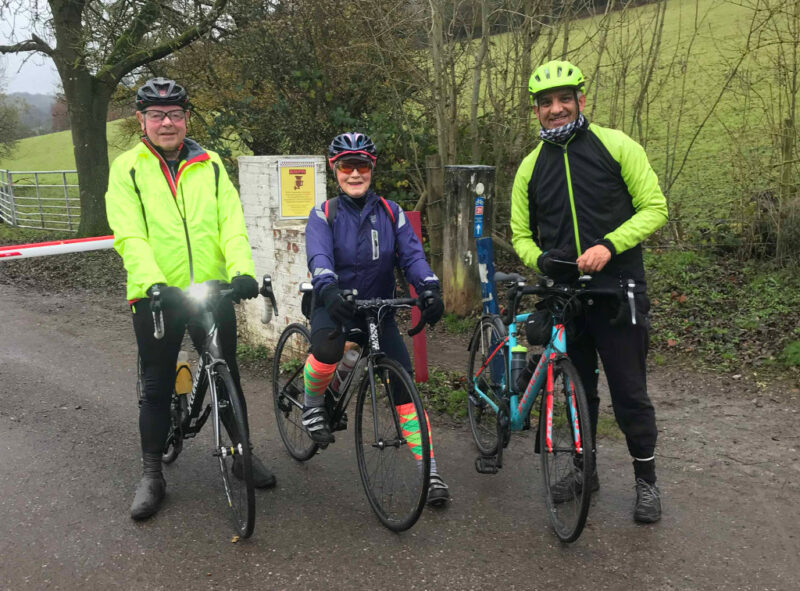Karen and Asif were waiting at Shurgard, both suitably attired for the wet weather and Karen sporting a rather striking pair of socks which were not only super highly visible on the road but also just the ticket for the golf club destination. Mick was running a bit late due to some wardrobe issues but joined us at the bottom of Old Lodge Lane wearing about 6 layers. This did lead to some overheating later and maybe the lesson is that if you can’t decide what to wear then wearing everything is not the answer.