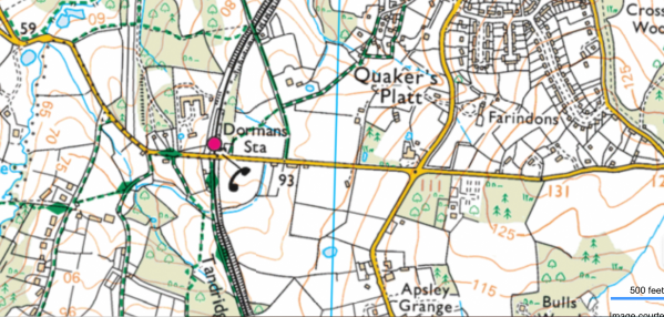 The Millenium Stone is where the blue vertical “Zero” line, in centre of above OS map section, crosses the road, just east of Dormansland railway station. You wont find that on Garmin!