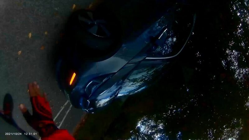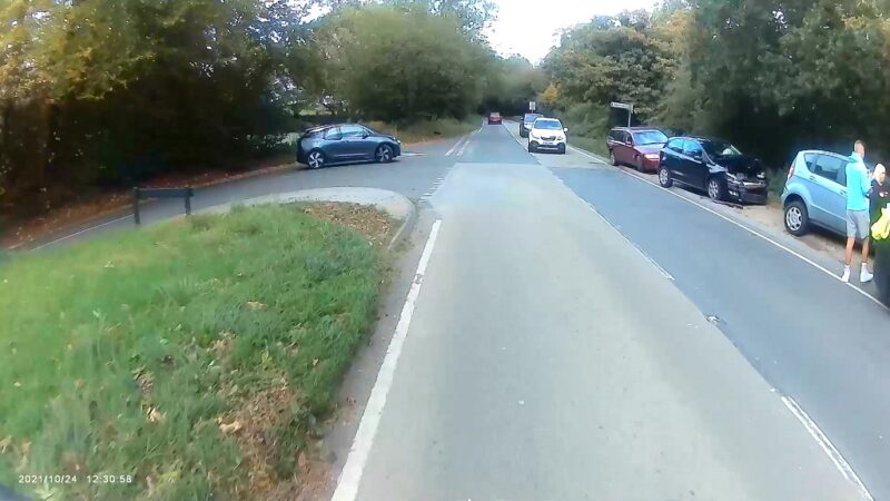 He decides to turn right – still not indicating. At this point he is still looking at the accident.
