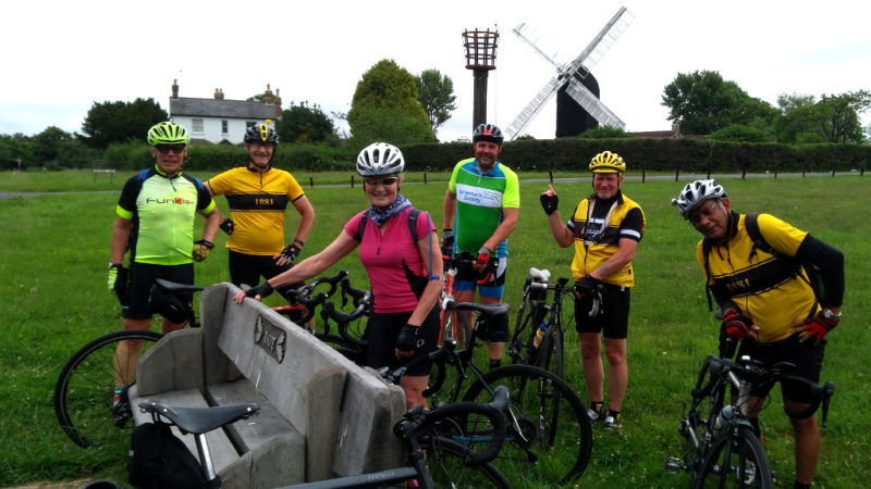Pic 1: Early 8am start for Eastbourne whizzing non-stop up and over Farthing Down taking our first breather at Dave’s Bench under Outwood’s windmill.