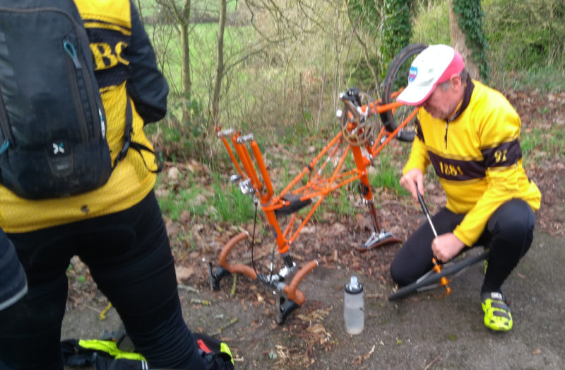 The return weas pretty much the same route. Back down the hill from the Farm was the third inrteruption of the ride. Mark had picked up a frontal flat from an errant flint. Here being fixed on the Mickleham by-pass cycle path: