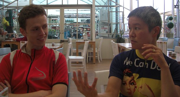 We welcomed Kristian and Tacey on a cool but dry outing to Surrey. We picked up a third ‘nearly new’ Andy at Chipstead Valley for a ride that took us passed Epsom Racecourse to Squires Garden Centre in Stoke D’Abernon for tea. Kristian is the man behind the Croydon Cycling Campaign’s website croydoncyclists.org.uk. Tacey bakes bread.