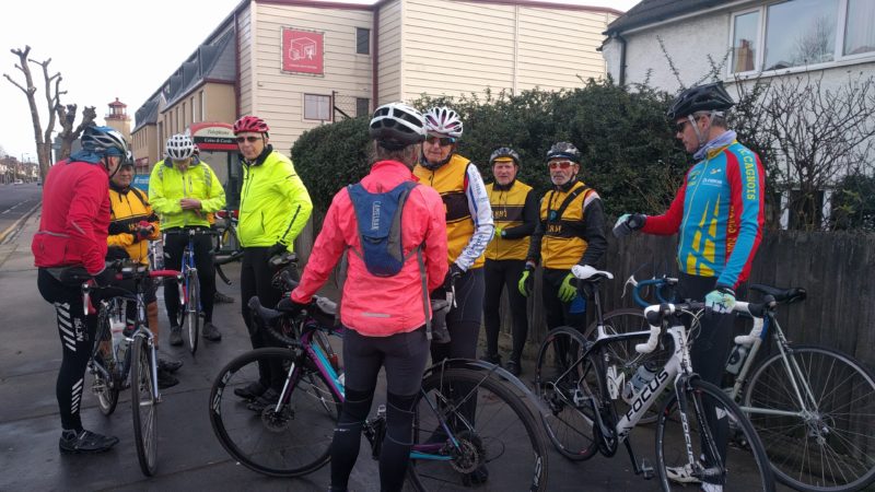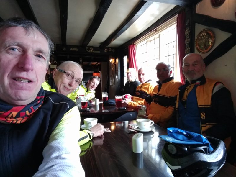 We doubled back via Newdigate and out through the cafe-free zone that is Capel. We did find a village store selling coffee, hot chocolate and stuff but they only had three chairs and we didn’t feel much like musical chairs. Finally Jeremy seized the initiative and led us to The Cricketers at Ockley. Undistinguished from the outside which made the inside quiet despite being quite lovely with a fine Ringwood on draught. And so the lonesome six had a celebratory round and a selfie …