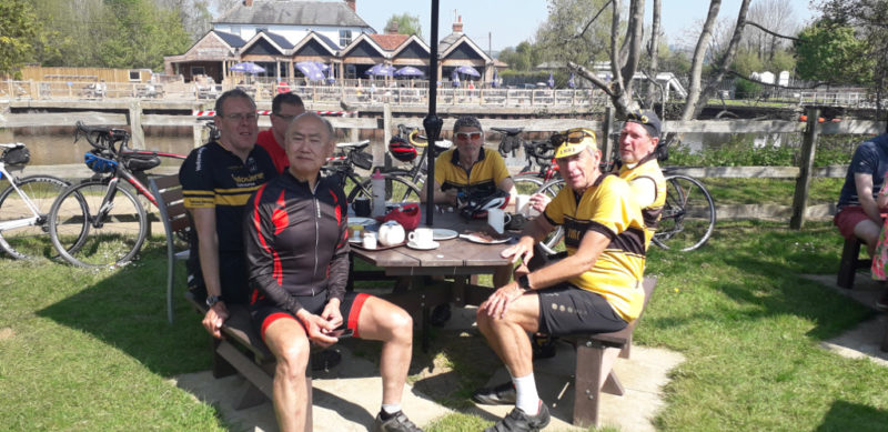 Six set out for the TeaPot Cafe at Yalding. The warm spring sun showeed Kent in its finest livery on Easter Sunday.