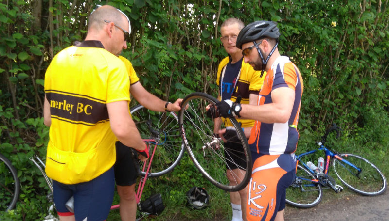 Yep, John E collected a front and back puncture. No problem with the fairy team splitting the repair task. Except the damage had extended to the rear tyre which promptly blew itself off the rim. John was pointed in the direction of the nearest railway station at Leigh. Did you get home OK?