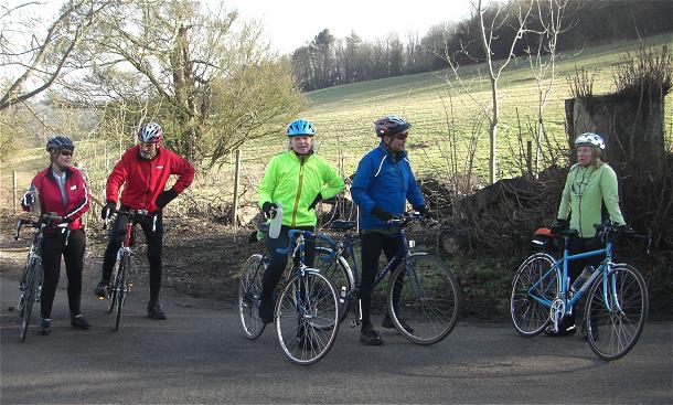 For the second time in two weeks a lady’s rear brought us to a halt. Happily Louise’s was repairable and the gentleman were free with gallant advice as she swopped the tube. Graham’s better half joined us for a half or so at The Royal Oak, Crockham Hill. We sat outside considering the meaning of life and why the two road signs showed two different mileages to the same place.
