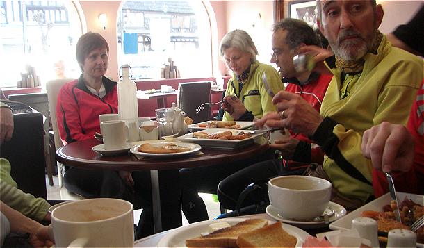 Inside everything had also been madeover in the same style. Except for mine host! The shapeless jeans, the vague grasp of the English language was reassuring and the availability of a ‘special all day breakfast with tea or coffee’ for £4.95 (less than a sausage roll and a drink the previous week at Chartwell) revived our spirits. And I didn’t mention the extra rounds of buttered toast. Or indeed that Des had joined us there.