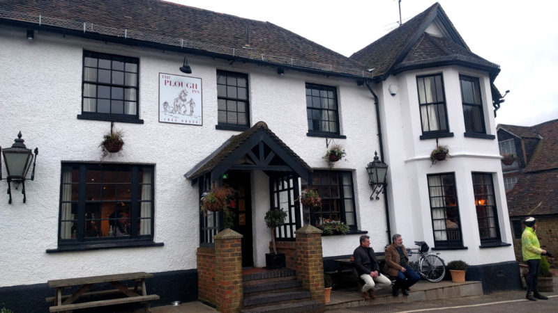 We doubled back to Bookham and then most of us turned west and then south to take us up Ranmore and down Whitedown Lane. Then the uppity-downy lanes passed Leith Hill to The Plough at Coldharbour. Here we lost a few more whilst assisting a rider who had lost a water bottle with necessary re-hydration. A very pleasant if rather expensive hostelry.