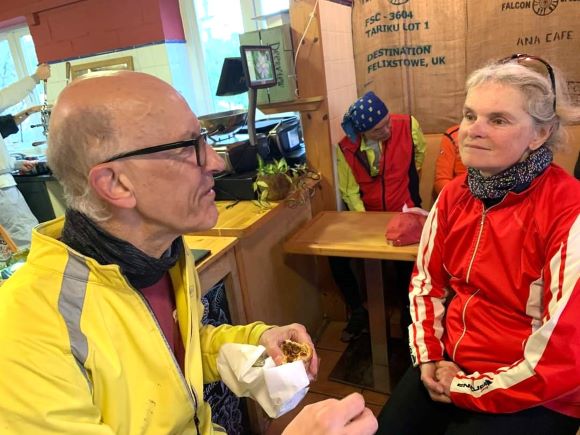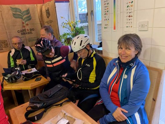 We then turned onto the Forest Way, a bit of off-road I had not done before, to arrive at Tablehurst Farm. It was too cold to sit outside so we all crowded into the coffee bar. No hot food so we all ordered coffee & tea before going next door to the farm shop, for pasties & sausage rolls – a bit expensive but tasty.