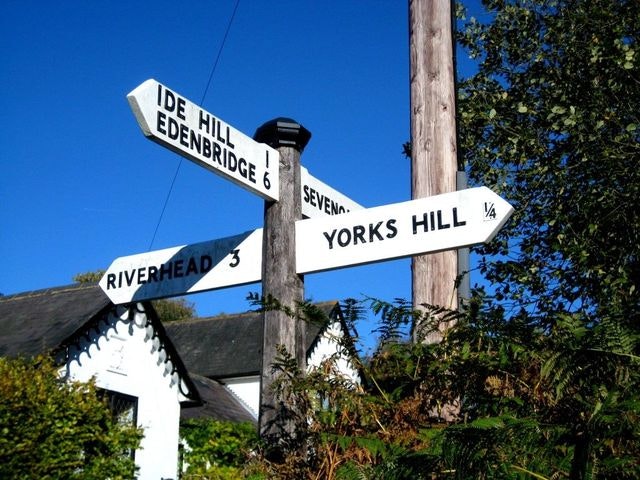 Westerham is situated in a valley with the North Downs Ridge rising up on one side, and the Greensand Ridge on the other, so there is no shortage of hills for the ride organisers to choose from. The ones that are named by them, are all in Kent and are along the Greensand Ridge – namely, west to east – Crockham Hill, Toys Hill, Yorks Hill, and Hubbards Hill. Of these we regularly cycle up Toys Hill, Yorks Hill we mostly avoid. However we often ride past the top of this particularly strenuous climb when cycling to/from Ide Hill to Sevenoaks along Goathurst Common. Here you should have seen this sign post.