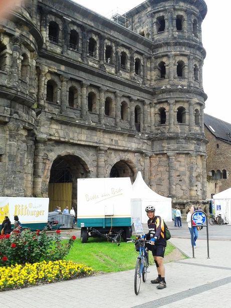 Trier is the oldest city in Germany. It became a Roman city in 16 B.C and later became the place from which the Western Roman Empire was ruled (Constantinople being the capital city of the Eastern Roman Empire). The centre of Trier is dominated by Roman ruins, the most famous being the Porta Nigra, the main gateway into the old Roman city. On this day there was a festival going on, hence wine and beer tents in the background and a very sober Tom in the foreground!