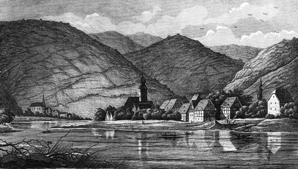 But we didn’t stop at the cafe/guesthouse because we now only had a short distance further to travel to our overnight stop at another wine village named Brauneburg, which I understand means Brown Mountain. It turned out to be a lovely village of old houses, farms and vineries, and a very large and grand church. As we forgot to take any photos I have to rely on a print dated to 1838, but most of the village of today was there then!