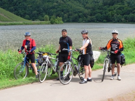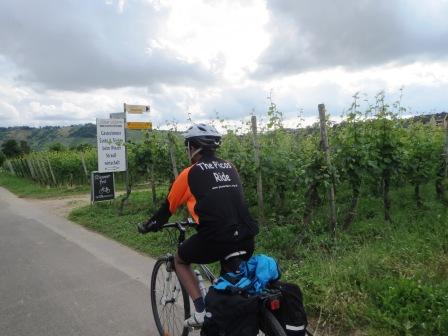 By lunch time it was time to re-start our travels. The Mosel at this point is about as wide as the Thames is at central London, and the Roman having built the first bridge over the Thames, also built the first bridge over the Mosel. However the Roman bridge at Trier was built with the local stone and still stands. Naturally we used this ancient bridge to take the cycle path on the other side. And just look at the “path”. More like a road than a cycle path! Wide tarmac, no potholes, and it goes on like this for mile after mile, after mile. Being a riverside path any gradients are minimal, and as we were heading down stream, it was all down hill!