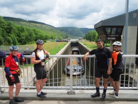 Fed and watered, we went over the bridge, and pedalled onwards following the twists and turns of the meandering Mosel, to Detzem. Here I understood was a lock. I was expecting something like the locks on our British waterways. So Detzem lock was a bit of a surprise! A most welcome and interesting feature of our Mosel ride.