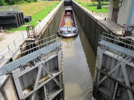 When we arrived, the huge cruise ship that had passed us at Schweich had just gone thru, and boats were queuing up on both sides of the lock awaiting their turn. The barge above, loaded with a cargo of steel plate, was next into the lock. It doesn’t look all that big, but that is because the lock is huge, 300 metres (nearly 1,000 feet) long!