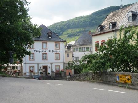 And soon we were to come to perhaps one of the most famous names in German wines. The little riverside village of Piesport. The large building ahead is named in Gothic script, which unfortunately you can’t read, “Cafe Landgasthof Alt Piesport”. In the background the wooded hillside has been cut back for the many acres of vines.