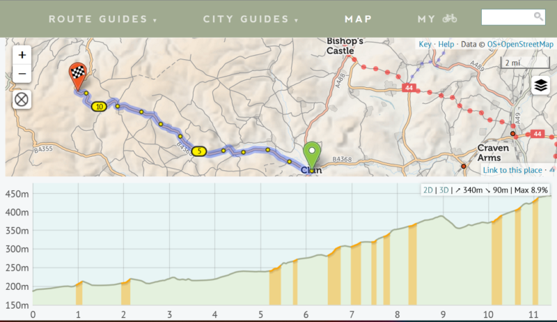 For cyclists on road bikes, wanting to follow the ridgeway on tarmac to Bishops Castle and back to Clun – a little further on from the bridge is a very minor lane on the right. This is the route to take!