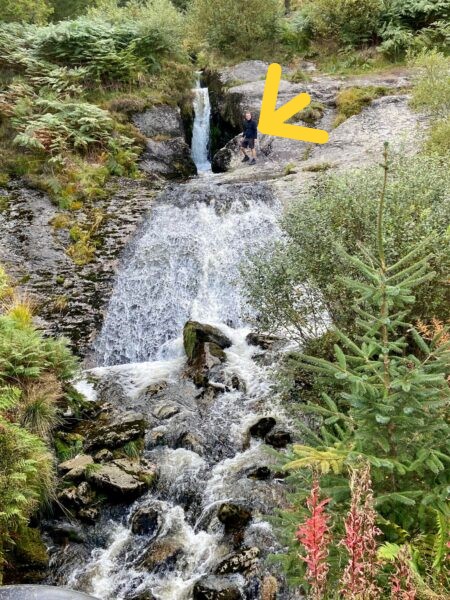 Above we were crossing the highest cascade. My son, arrowed, indicates how great the drop is, up near the source of the Afon Hafren.