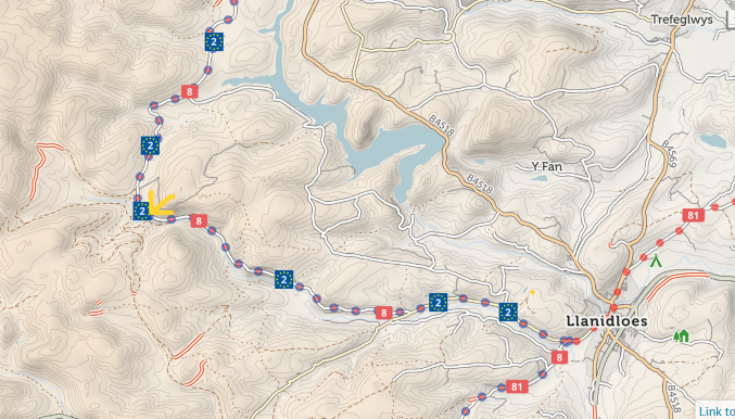 Passing through the village of Kerry – or Ceri to give it the correct Welsh spelling – we joined some main roads to take us to the little Welsh town of Llanidloes. Here we joined NCR 81 briefly, to shortly join NCR 8. This cycle route is the most important in Wales, stretching from Cardiff in the south to Holyhead in the extreme north west. At this point it is a narrow little country lane which passes thru the Hafren Forest and the entrance to it’s visitor centre. It also provides road access to the magnificent Llyn Clywedog (centre of map below), which due to it’s shape is also known as the Dragon’s Tail Lake.