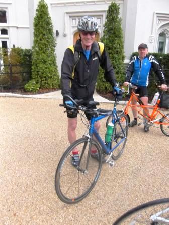 Early rain had ceased by 10 o’clock when we met at Tesco, Purley. Along the way we picked up Jenny at Coulsdon, plus a very welcome new face to the Thursday Rides. But not a new face to Anerley B.C as he attended at least the last two Annual Dinners. This was Dave Grant, the husband of Jenny, who set off with us riding a blue Ridgeback fitted with straight bars with tri-bars added, Dave being a member of the triathlon section of the South London Harriers. Man and machine are shown below with Mark Hancock our ride leader in the background.
