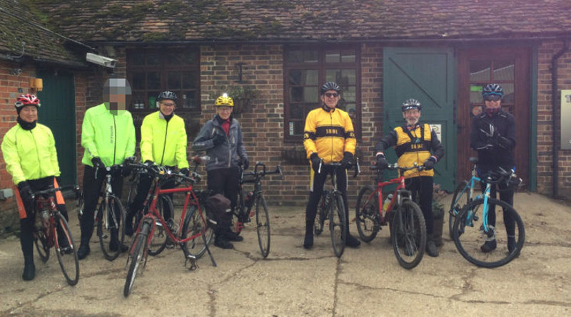 We set off over Farthing Downs which was a bit harder than usual as we had to fight a brisk headwind and then descended Hill Top Lane with its tricky left hand bend at the top without incident. In fact, for once, the road was dry and not slippery. On through Bletchingley, Outwood, Small Fields and Copthorne. Barely a mile and half from our destination, at Hay Heath, D punctured. Dave & I helped with replacing the inner tube while the others pushed on to Tulley’s Farm.