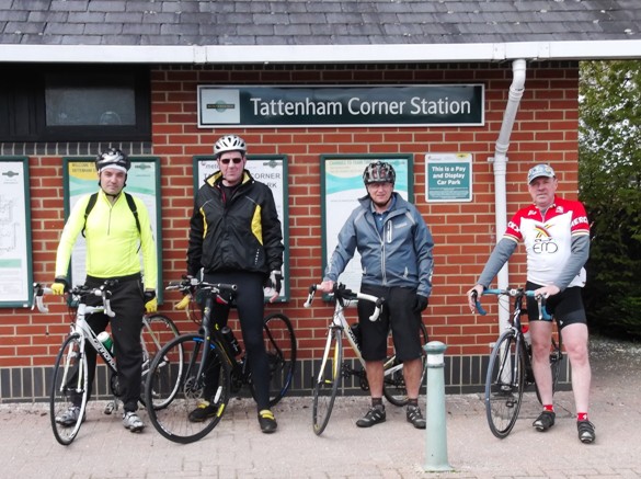 Philip had an appointment to keep so it was arranged that he would get the train to Tattenham Corner, arriving at 11.38. This determined the tea stop – Annie’s – at Leatherhead as we should then be able to get there shortly after 12 noon. I then had to work out a route, leaving Purley at 10, to arrive at the Tattenham Corner as near as possible to 11.40. I would like to claim that it was my excellent judgement, but luck did play its part! As we rolled up at the station we saw the train coming in so neither Philip nor us were required to wait about in the blustery wind. The “we” being myself, George, David and Mark Hancock, now of course joined by Philip.