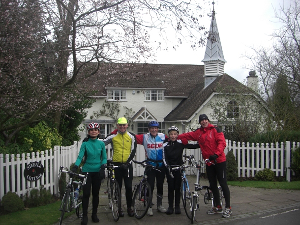 From our photo shoot we continued onwards to Annie’s Tearoom at Leatherhead. As we went into the pedestrianised area by the bike shop, Cycleworks, we caught up with John and Meike. A first for most of us was that John was walking aided only by his walking sticks, and which he continued for the long walk all the way to the tea shop. This is great progress and a good start for him in 2012!
