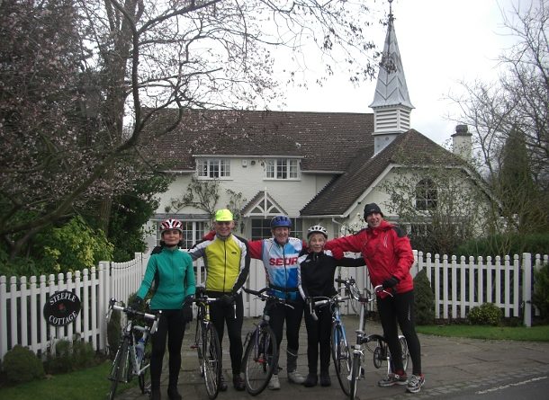 It was great to have Sandra back after her knee op, and although it is still a bit painful I couldn’t keep up with her. Not sure if that is a sign of her enthusiasm, or my old age. Another welcome back (only his third Tuesday ride), was Stuart. He’s the one with the funny bike. Just back from a trip to Welsh Wales, where the ease of transporting his versatile Brompton folder makes train travel a pleasant experience. On a dull and overcast day, John Dadson added the colour (it will soon be daffodil time, John). And last but not least there is Sharon who at this rate will soon be up for the Anerley B.C Club Run Attendence Award.
