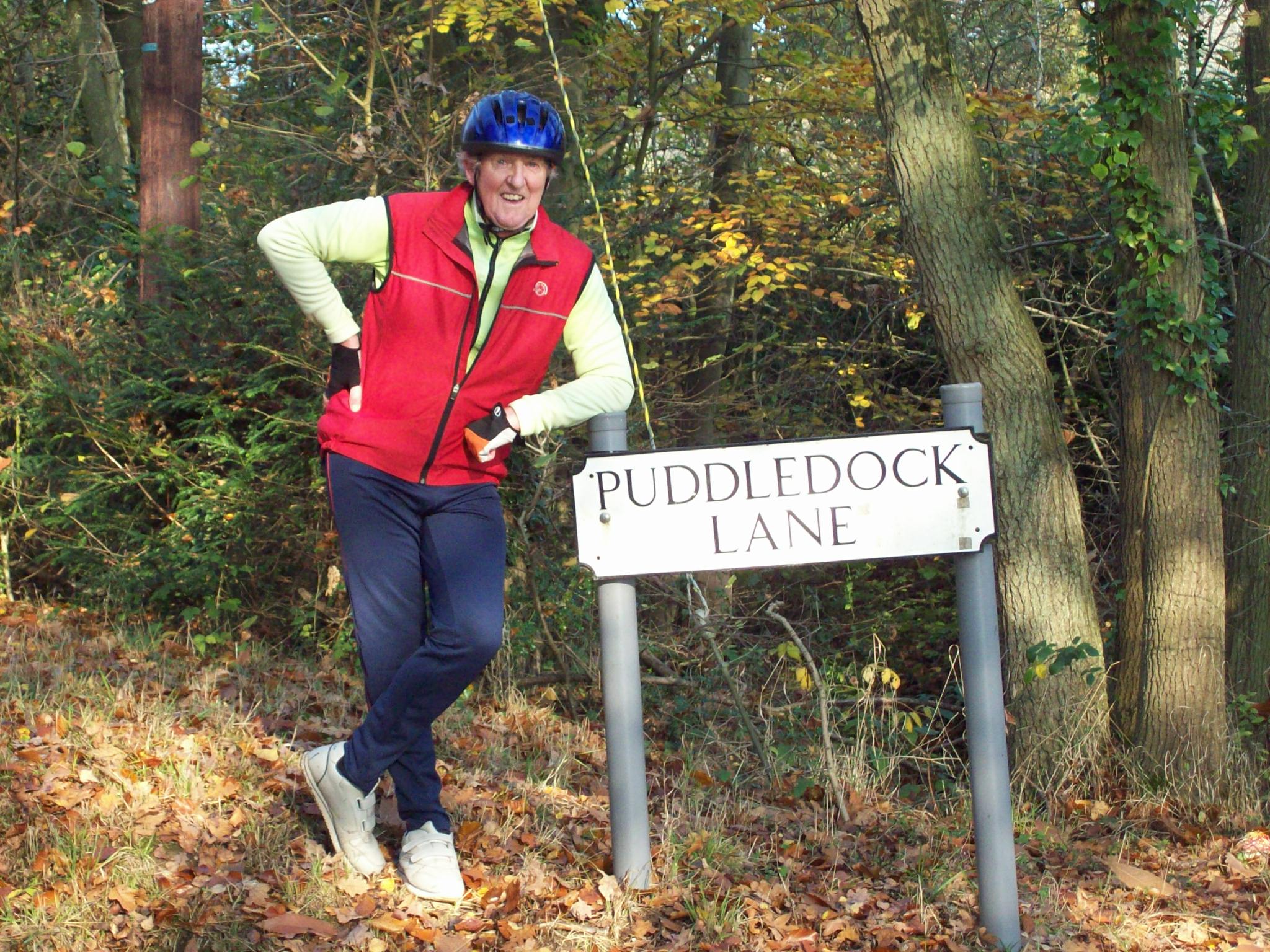 Further on the lane starts a steep descent, made tricky by fallen, wet leaves and a rock strewn road surface. I went on aheard to get a photo of John and Sandra picking there careful way down this sunlit cutting. We were all glad when we reached the bottom and turned into the delightfully named Puddledock Lane!