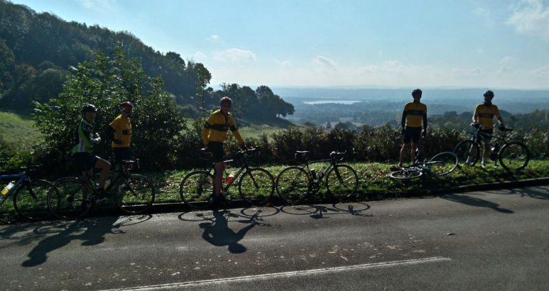 We didn’t get away until 9:45 as Paul had an unfixable puncture at the start by which time the ten o’clockers were gathering. We shot up Botley Hill [above] before descending to Braested and up Ide Hill. Always an arduous climb but today’s autumnal sun the view from the top was absolutely stunning: