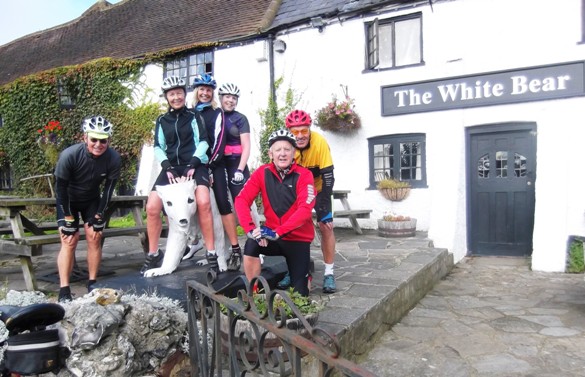 The White Bear also provided an excellent background to show off our newest recruit, Jo Rifaat, together with her new bike, a very nice Haibike 820 model with a sensible choice of a triple chainset. Extra gears are very useful to get up and over the many steep climbs in Kent and Surrey. And this day’s ride would certainly be a good test of the climbing abilities of both bike and rider!