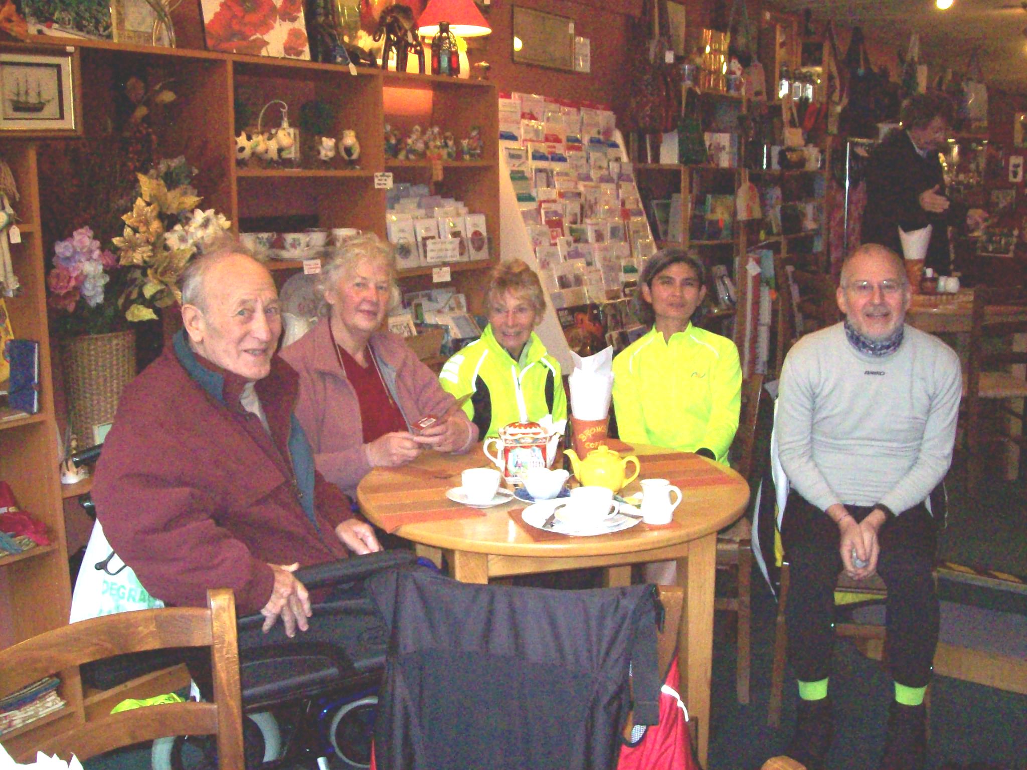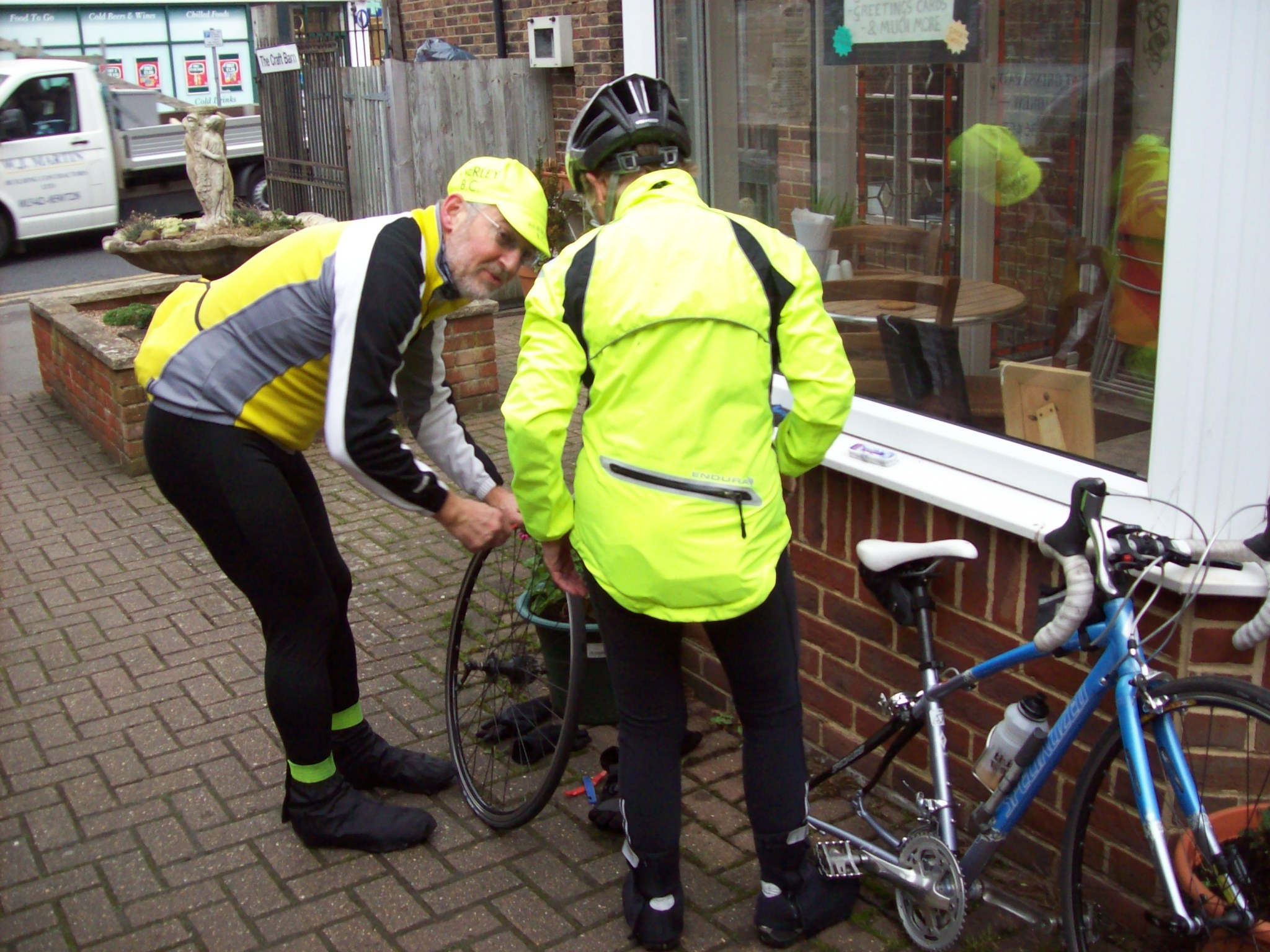 But this was not the end of John’s pneumatic drills. Ninety minutes and 15 miles further on it was Sandra’s turn to suffer the deflating effects of a slow puncture. She managed to get to our tea stop, where noble John came to the rescue of our damsel in distress and did another quick inner tube change.  What a gent. Who said that chivalry was dead?