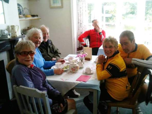 As we cycled the last half mile to the tea room at Abinger we passed “A” Group as they started their return leg back to Purley. They did however add another photo to add a bit of colour. Here are some of them enjoying the fine fare with John and Meike at the tea stop. Note the bone china cups and tea pot of a real, traditional English tea room!