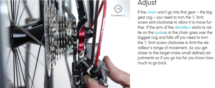 The photo below shows the two screws, normally marked H and L, for adjusting the movement of the chain on the highest and lowest gears. And the next photo explains what to do.