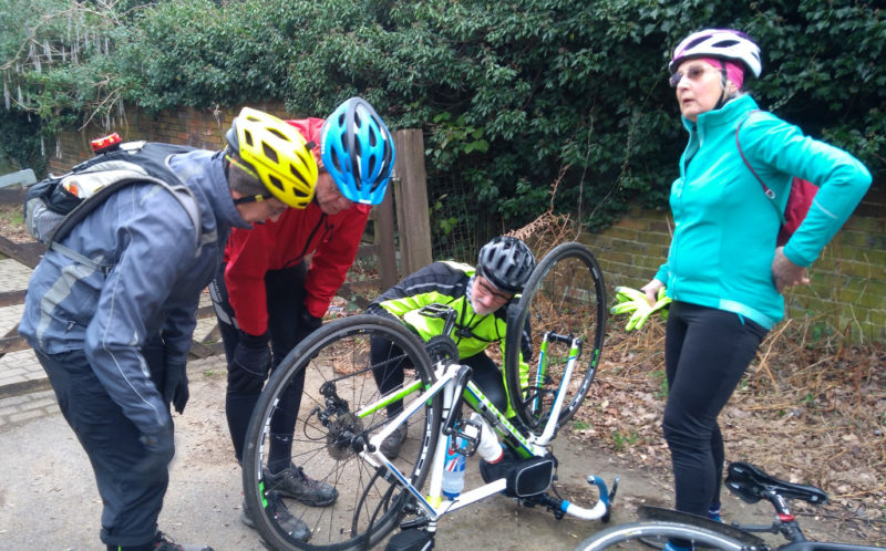 Tina retired back home with a wobbly fron (tyre) escorted by Sandra. Jo’s gears appeared to have been knocked and not changing correctly. Here Dave Go and others magic them back into working order.