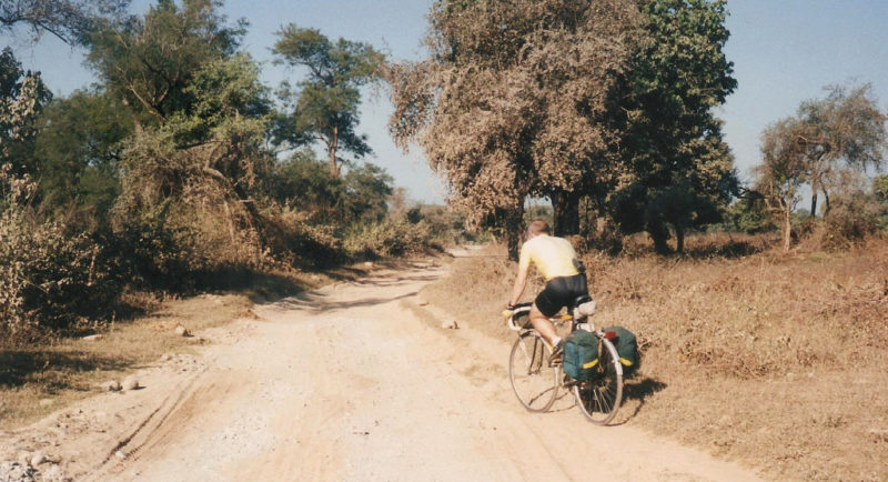 John had recovered from his fever and next day we set off at a gentle pace for Haridwar, a Hindu sacred city on the Ganges. The map showed 45km of main road to Haridwar. After 15 miles the “main. road” degenerated, into a rocky; sandy track through dense jungle. Sometimes we rode, sometimes we trudged. “How far does this go?” ran incessantly through my mind.