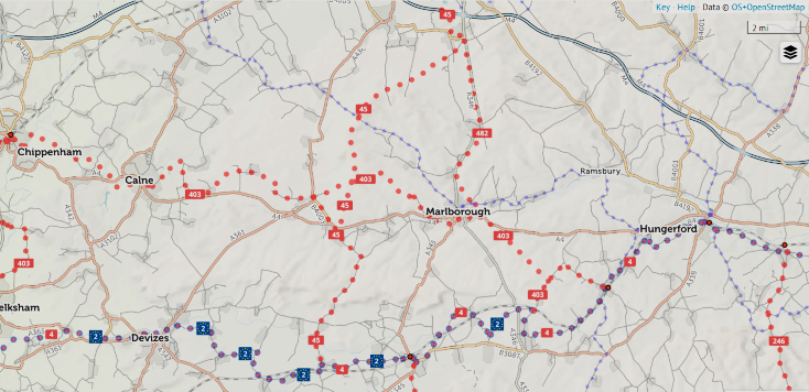 However a problem arose over getting suitable accommodation in Hungerford for the dates we required. This was soon resolved by a Premier Inn a bit further west at Marlborough. It turned out to be ideally placed for cycling, see map below.